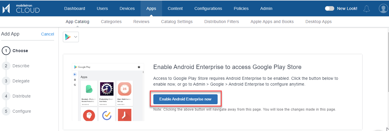 Androidデバイスが含まれているIvanti Neurons for MDMテナントの場合、2021年3月末までにAndroid Enterpriseが有効化されないと、管理者はそれらの名前を持つアプリを検索できなくなります。 この変更に関するお知らせは、アプリカタログページにアクセスするとバナーメッセージに表示されます。 このバナーメッセージは、それらのテナントでAndroid Enterpriseが有効化されるまで、また「このメッセージを再び表示しない」チェックボックスオプションの選択が解除されるまで、引き続き表示されます。