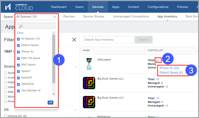 ドロップダウンリストから複数のスペースを選択すると、すべてまたは複数のスペースのデバイスのアプリインベントリを表示可能です。 表示されたアプリの上にポインターを置くとデバイス数が表示されます。 デバイス数をクリックするとアプリを含むすべてのデバイスが表示されます。 各アプリインベントリのレコードはスペースごとにグループ化されています。