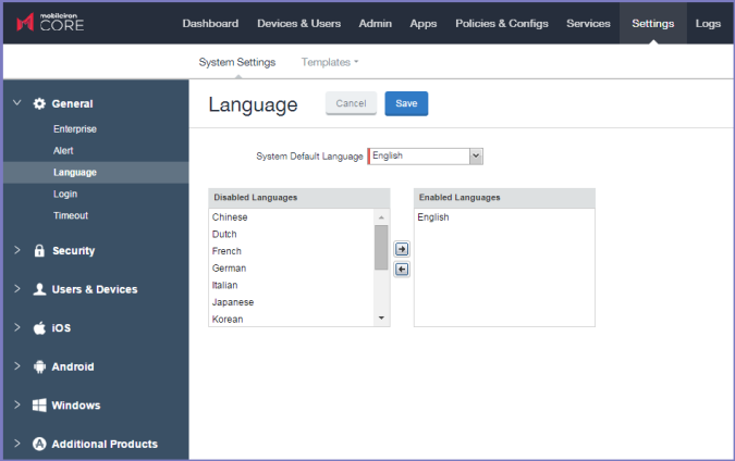 The System Default Language setting under Settings > System Settings > General > Language determines the language to be used if the locale of the device cannot be determined or the corresponding language is not supported. The languages available for this setting are determined by the languages in the Enabled Languages list.