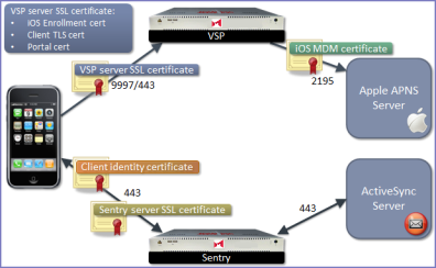 The following diagram illustrates where each certificate type is used in the MobileIron architecture: