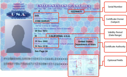 The following diagram compares a certificate to a passport: