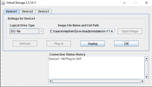 You must have previously downloaded a copy of the ISO image to your local device to populate the image this way. The Core image begins mounting on the Core M2700 appliance. When complete, the connection status displays in the Connection Status History field.