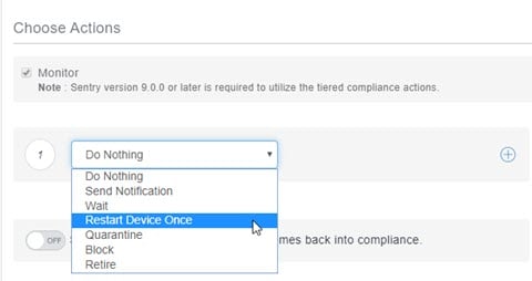 - Restart Device Once – When a device goes out of compliance, the device is restarted. This will bring some devices back into compliance.