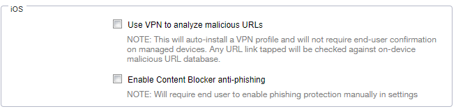 Content Blocker – (iOS devices) This option blocks all network traffic when a phishing threat is detected. Once cleared, network traffic is again allowed. The end user must enable this feature.