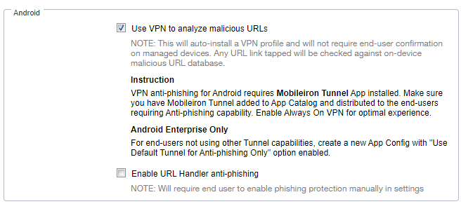 On-device VPN to analyze malicious URLs – This option uses VPN to provide anti-phishing protection without requiring end-user confirmation. Tapped links are checked against an on-device database of malicious URLs.