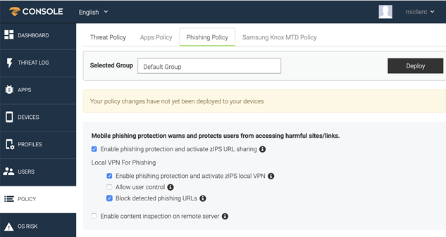 Click Deploy to distribute the phishing protection policy to the selected device group. For iOS clients, anti-phishing is enabled.