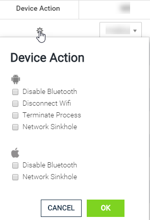 4. From the Device Action column, click the settings icon for the selected row, and select an action. MTD console securely communicates with Core and applies the action.