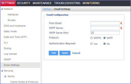 Use the Email Settings page to configure the SMTP server. This configuration is required for Sentry monitoring alert notifications by email.