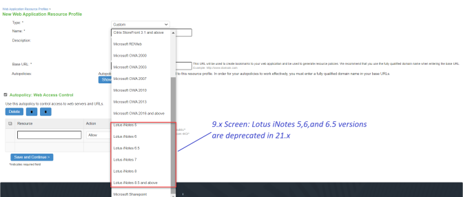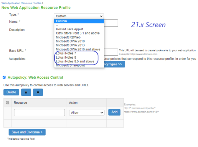 The system supports intermediating traffic to Lotus iNotes through a Web rewriting resource profile template, JSAM, PSAM, and VPN Tunneling. This topic describes how to configure access using the Web rewriting template. The prepopulated values vary depending on the version of iNotes you select and are based on the most common deployment of the servers.