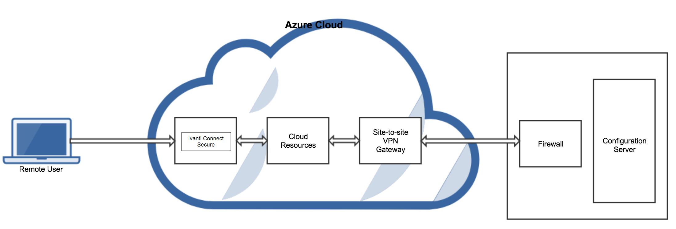 Ivanti Connect Secure configuration can be kept on Azure VM or on a machine located in the corporate network. If it is in the corporate network, the Ivanti Connect Secure administrator needs to ensure that site-to-site VPN between Azure to corporate network is already established so that Ivanti Connect Secure can access the machine located in the corporate network.