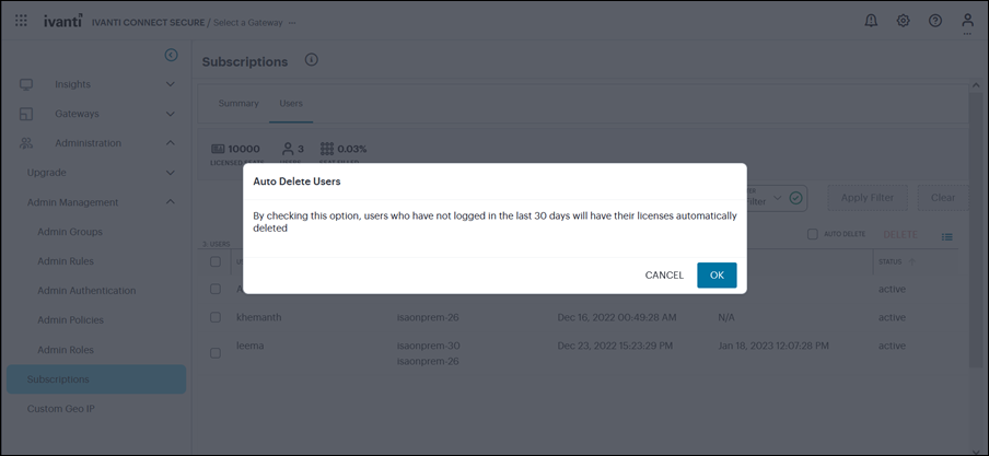 •Allows automatic deletion of users if they have not logged in last 30 days.