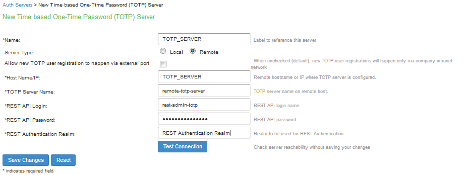 TOTP server can be configured as local or remote. Select Remote. Remote: In this configuration, authentication checks take place on the remote TOTP server. The user local device (ICS to which user is logging in) will act merely as a proxy between the user's client device and TOTP server. The communication to the remote device happens on REST API. |