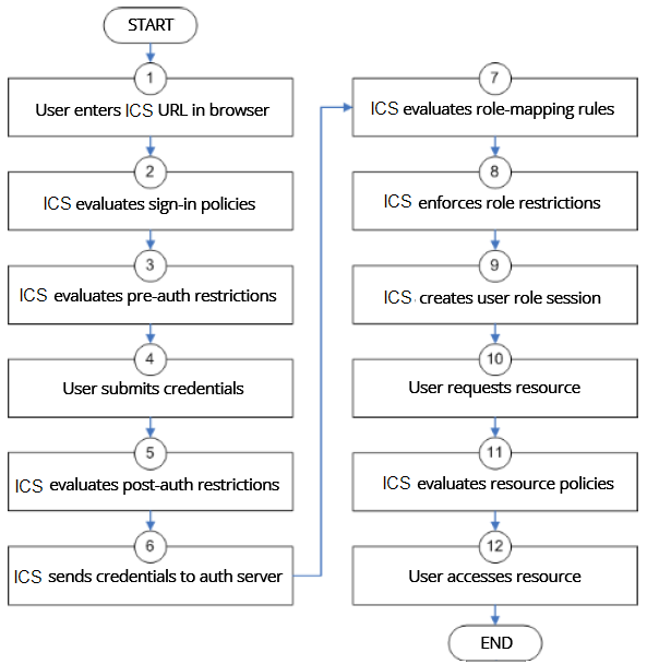 12.The user accesses the requested resource or application server. The user session ends when the user signs out or the session times out due to time limits or inactivity. The system may also force the user out if the session if you enable dynamic policy evaluation and the user fails a policy.
