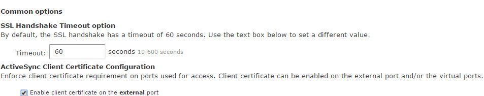 1. Select Enable client certificate on the external port under ActiveSync Client Certificate Configuration. See the ActiveSync Client Certificate Configuration figure underneath.