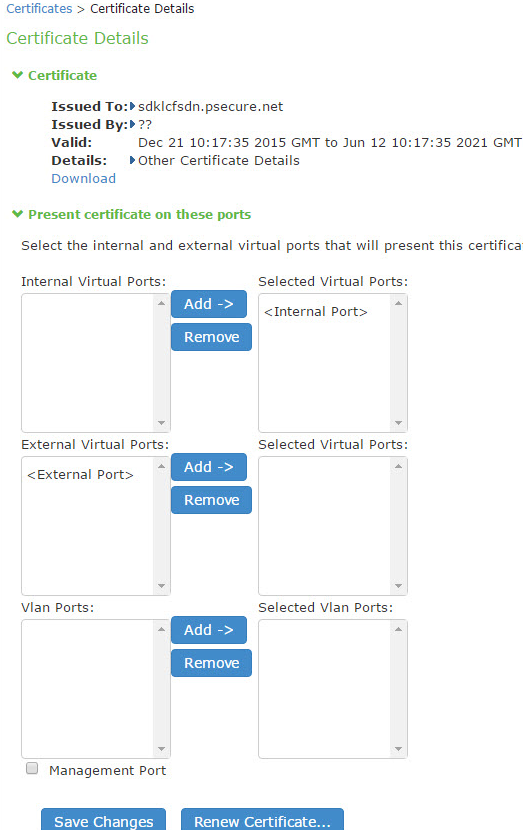 A virtual port is an IP alias bound to a physical port. It shares all of the network settings, except IP address, with the associated physical port. You can use virtual ports for different purposes, depending on the physical port or the VLAN on which you base the virtual port. In this example, we are configuring the virtual port on the external port to support external sign-ins. This is an optional step that shows one way of allowing multiple certificates on the device.
