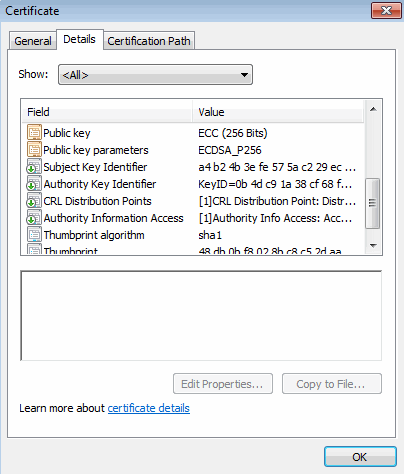 3.Click the Details tab and scroll down until you see the Public key field. In this example, the public key value is ECC (256 Bits) which matches the server port p3 certificate shown in the following figure.
