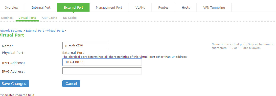 In this example, the port is named p_ecdsa256 and accepts only IPv4 addresses. See the following figure Creating the Virtual Port on the External Port .