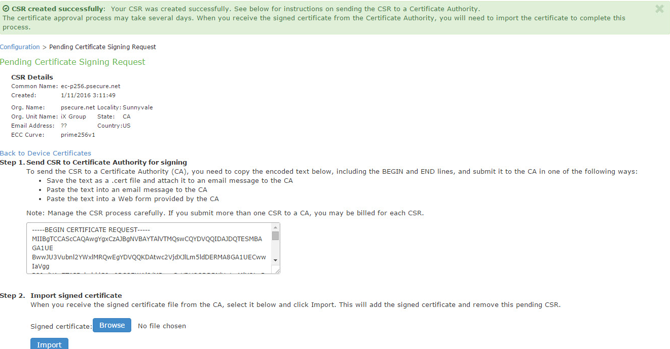 3.Under Import signed certificate, browse to the certificate file you received from the CA and then click Import. See the above CSR Successfully Created figure.