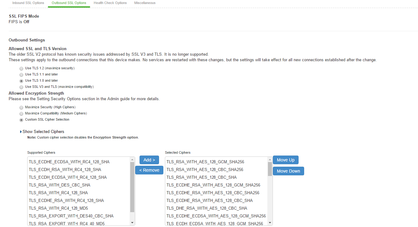Only for Outbound SSL Settings, we can configure Non FIPS Ciphers when FIPS is Enabled using Custom Cipher Selection Option. Now, there are options to change different SSL/TLS versions and different encryptions in the Outbound SSL Settings. Outbound SSL Settingsshows the Outbound SSL Settings.