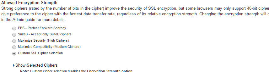 2.Under Allowed Encryption Strength choose Custom SSL Cipher Selection. See the following Setting Custom SSL Cipher Selections figure.