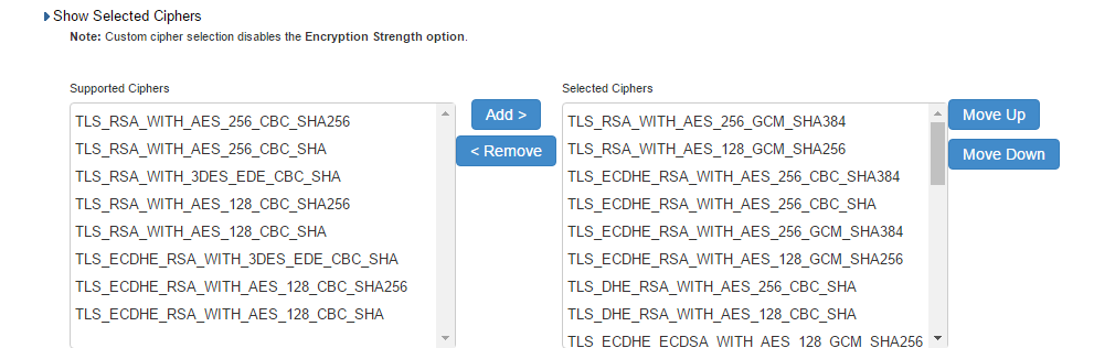 6.The selected ciphers on the right are listed in order of their priority from top to bottom. To change the priority of the ciphers, click on the cipher name and then click on Move Up to increase priority or the Move Down button to decrease the priority. See the Setting Custom SSL Cipher Selections figure underneath.