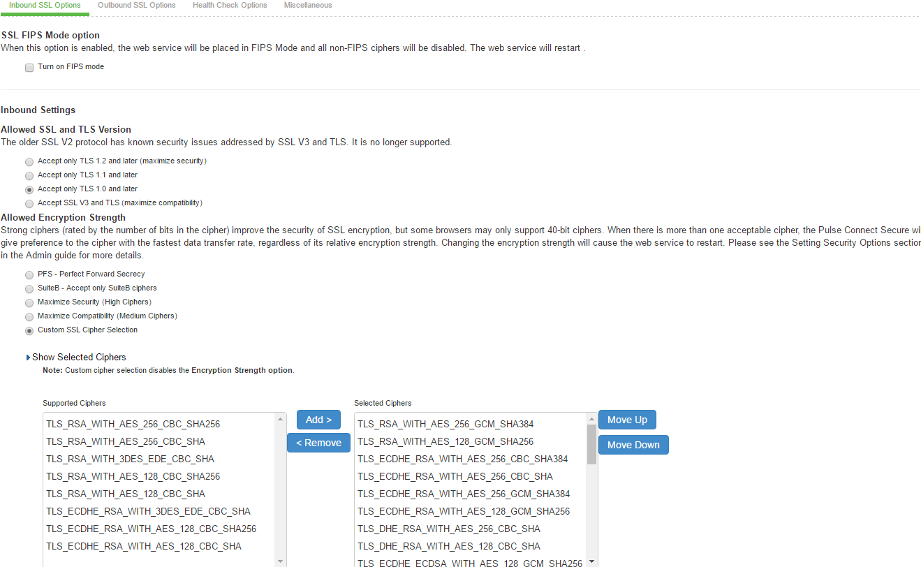 Only when FIPS mode is turned on, the FIPS compliant ciphers are available to be chosen from the Supported Ciphers panel. FIPS mode is editable only on the inbound option page.