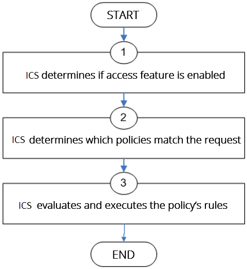 The system evaluates a set of resource policies for an access feature from the top down, meaning that it starts with the policy numbered one and then continues down the policy list until it finds a matching policy. If you defined detailed rules for the matching policy, the system evaluates the rules from the top down, starting with the rule numbered one and stopping when it finds a matching resource in the rule's Resource list. The following figure illustrates the general steps of policy evaluation: