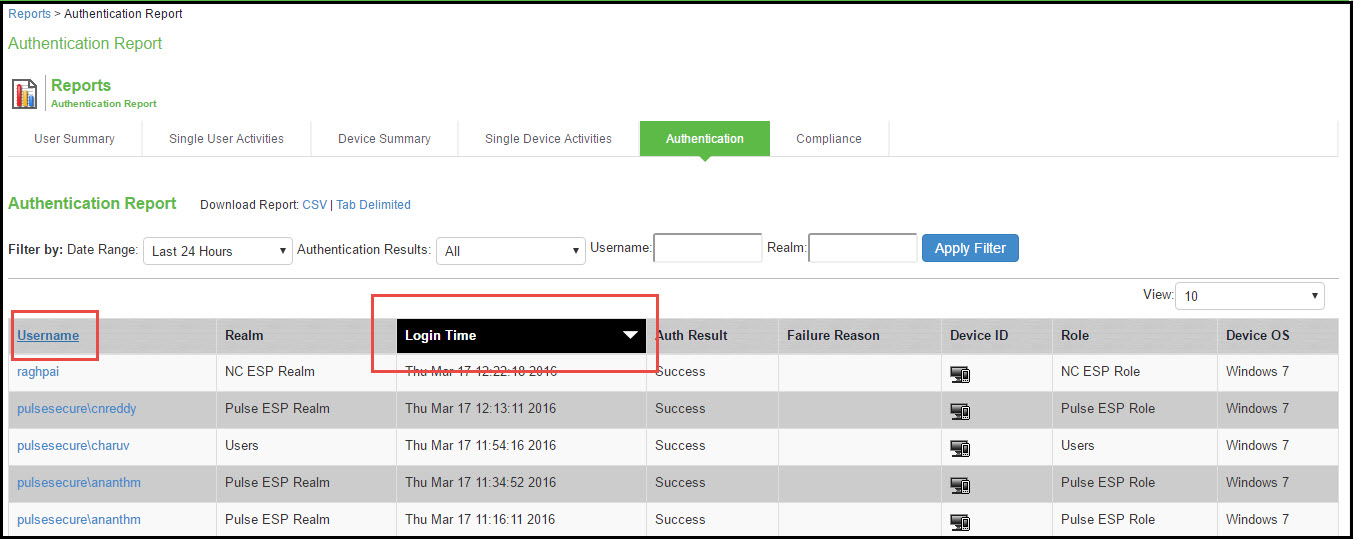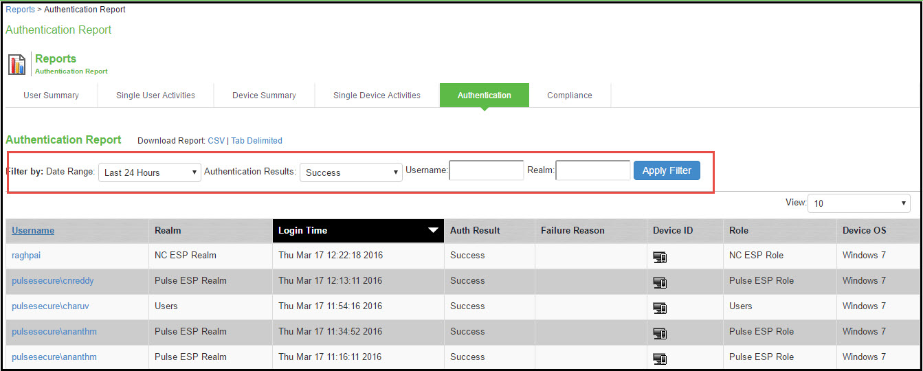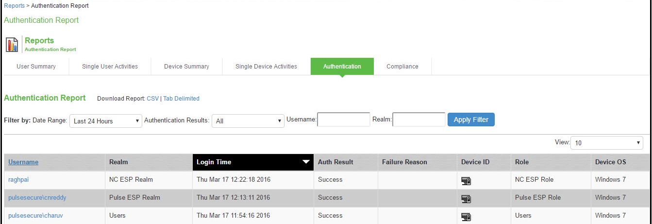 The authentication report displays the authentication result for each user based on the device activity in the selected time range.