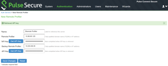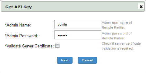 5.Click Get API Key. In the Get API Key window, provide the credentials of valid administrator on IPS/Profiler server and click Next. The API key generates and displays in the API Key field.