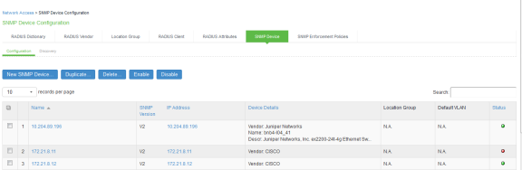 You can also discover an SNMP device and add to SNMP Device Configuration table from the Discovery tab. See the IPS Policy Enforcement Using SNMP Deployment Guide for additional SNMP switch configuration details.