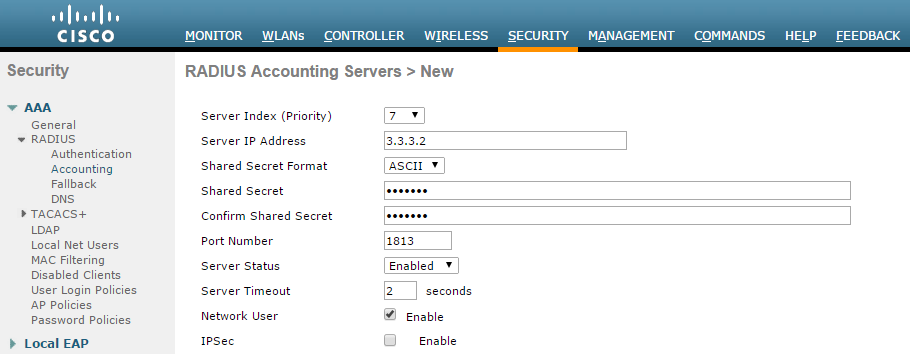 - Login to Cisco WLC. Go to Security > AAA > RADIUS. Configure IPS server as authentication and accounting server.