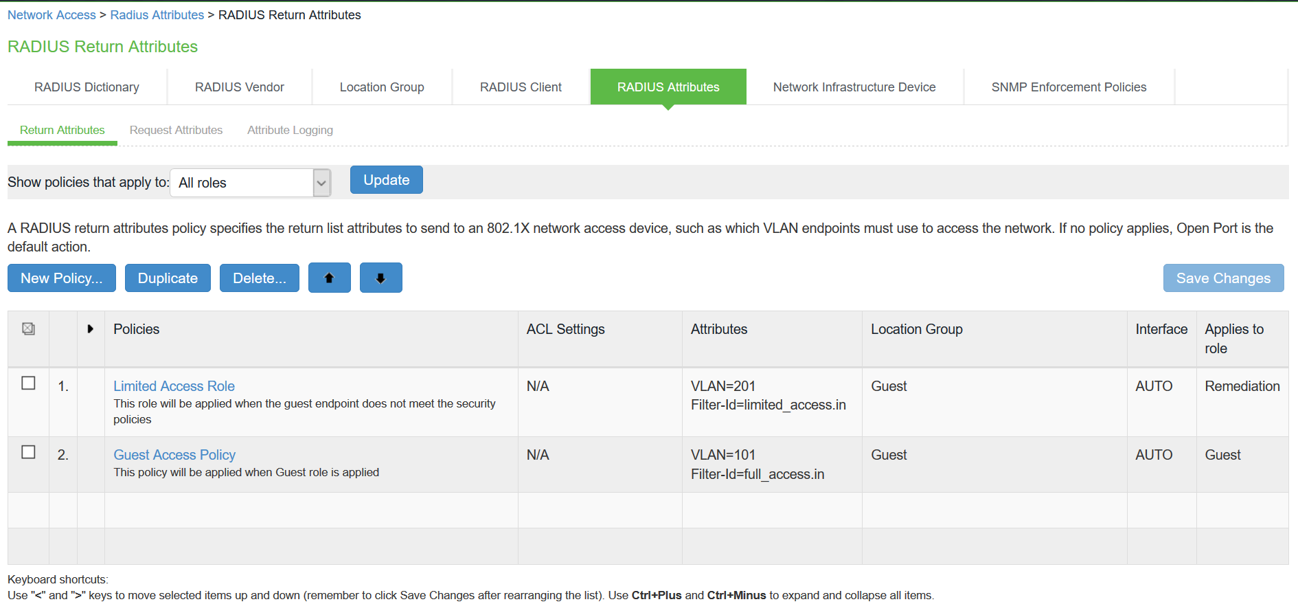 The following example shows RADIUS return attribute used to send the VLAN ID. In the below example, VLAN 101 is sent for Guest Access Role and VLAN 201 for Limited Access Role.