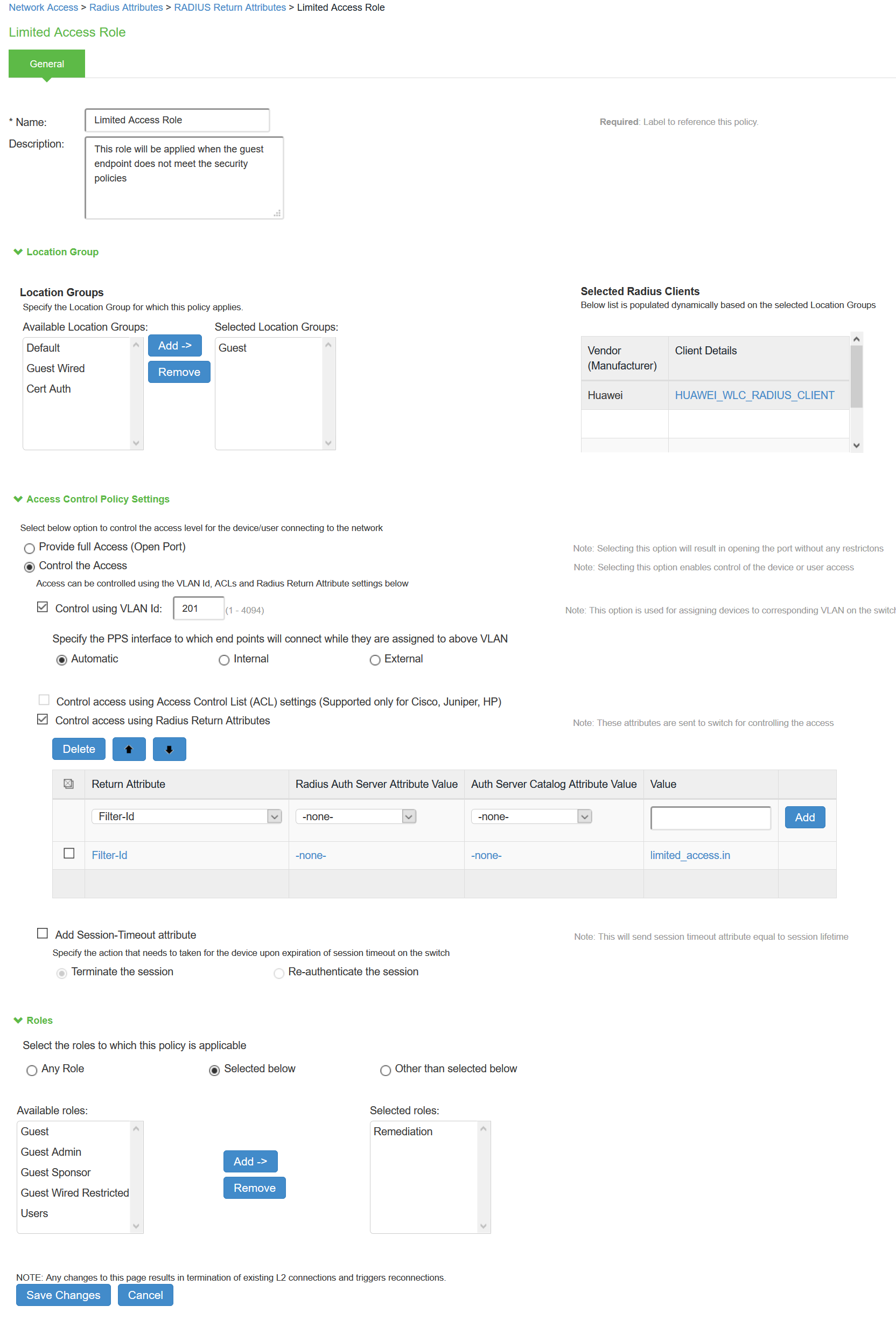 Similarly define a remediation policy with Return Attribute as Filter-Id and Value as limited_access.in.