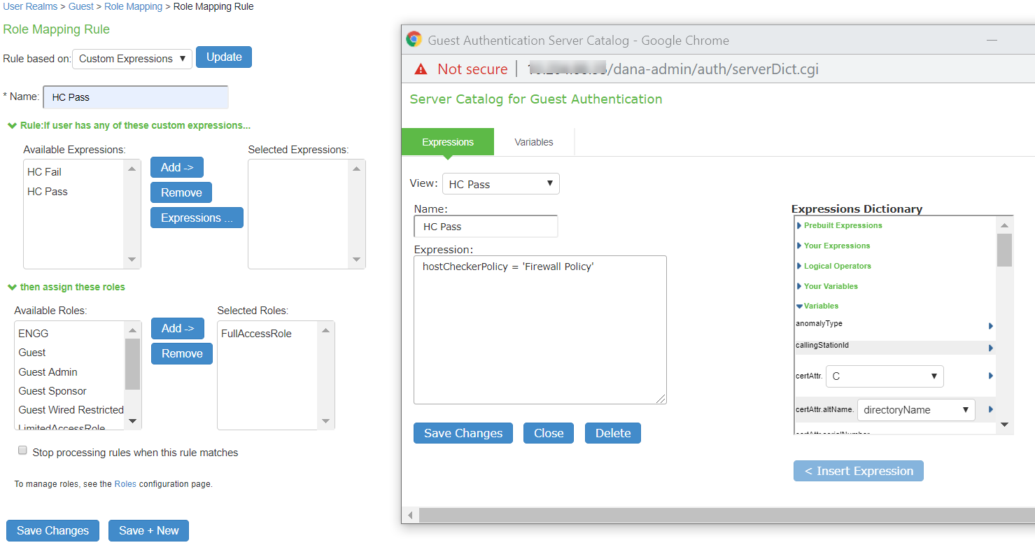 - Select User Roles > <Full Access Role> > General > Restrictions > Host Checker. Add the Firewall Policy restriction created earlier inCreating a Host Checker Policy for Full Access Role. Click Save Changes.