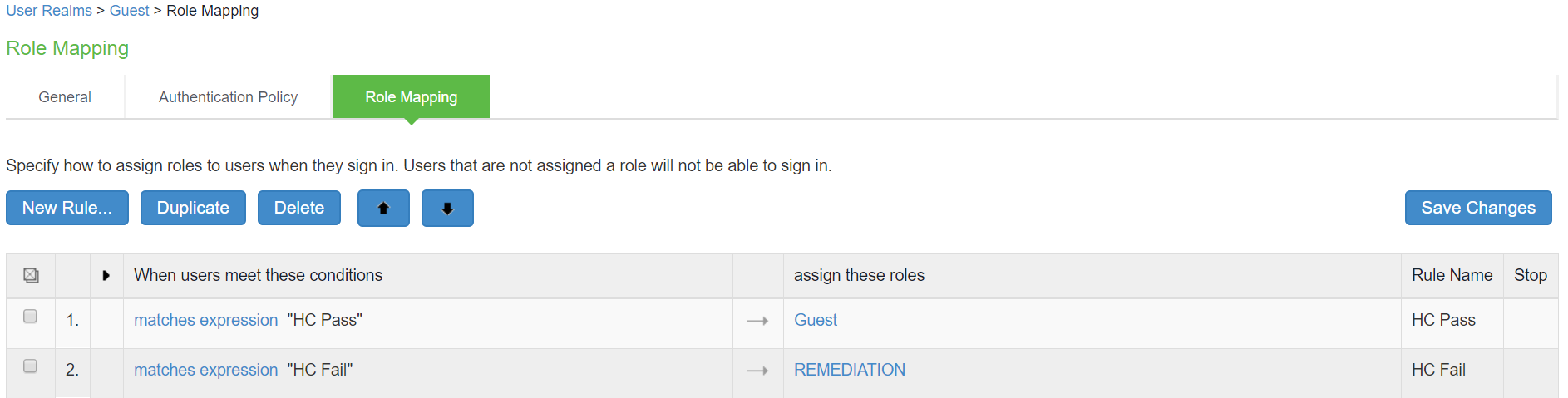 - Set Role Mapping rules. Select User Realms > Guest > Role Mapping > New Rule.