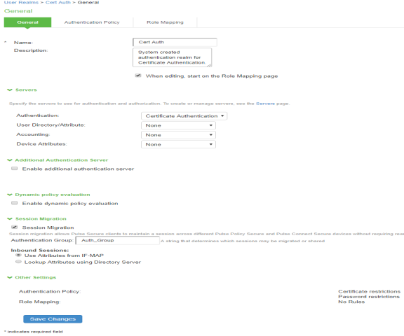 When a session is migrated, realm role-mapping rules determine user access capabilities. You can import user attributes when a session is migrated, or you can configure a dedicated directory server to look up attributes for migrated user sessions. To ensure that session migration retains user sessions, configure a limited access remediation role that does not require a Host Checker policy. This role is necessary because the Host Checker timeout can be exceeded if an endpoint is in hibernation or asleep. With the new remediation role, the user's session is maintained. The session migration works only with same authentication group.