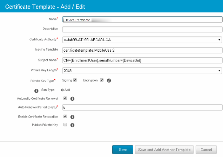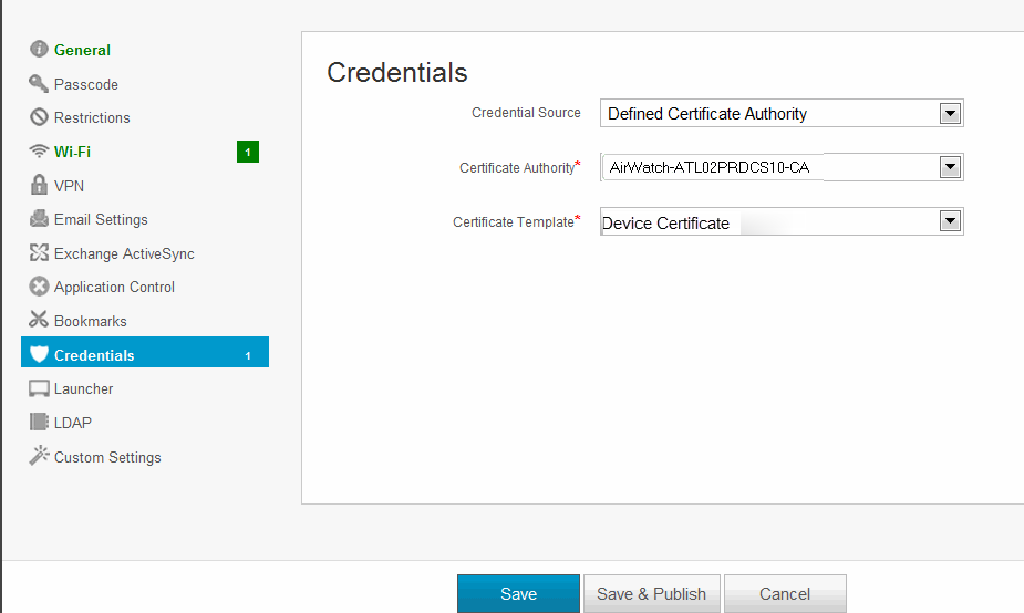 CN=<EnrollmentUser>, serialNumber=<DeviceUid>, o=Company - Credential profile- Create a configuration that specifies the certificate authority and certificate template configuration.