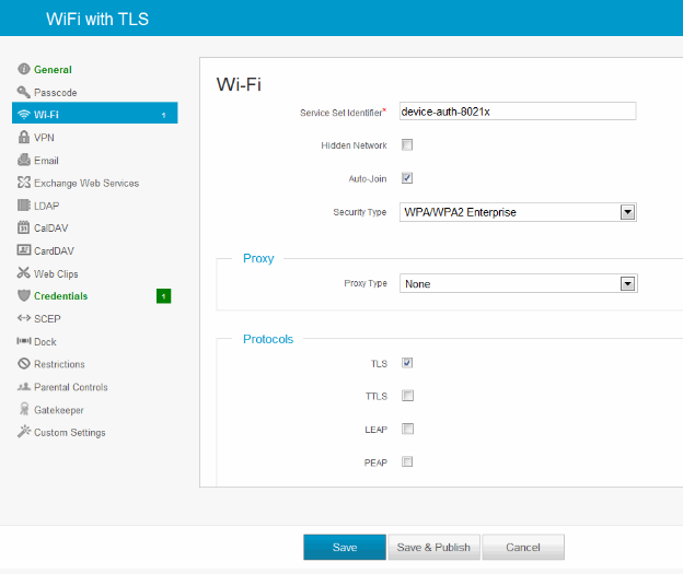- Wi-Fi profile- Create a configuration that specifies the SSID, security options, and the credential configuration.