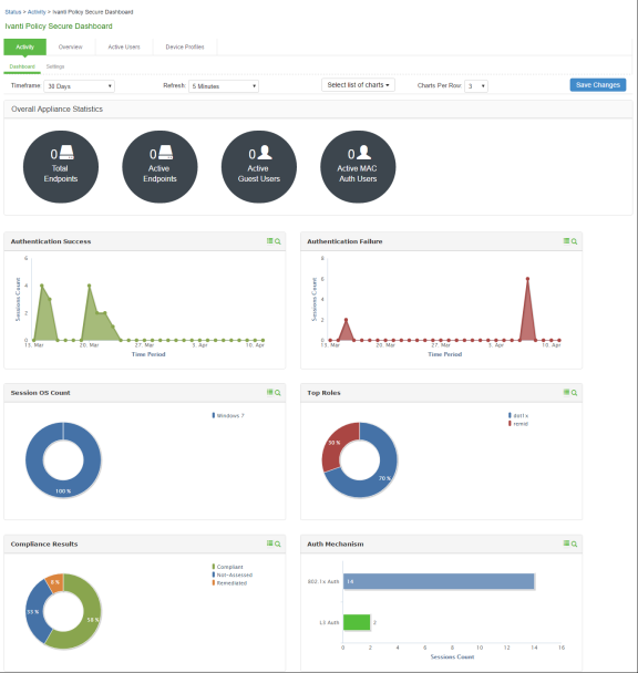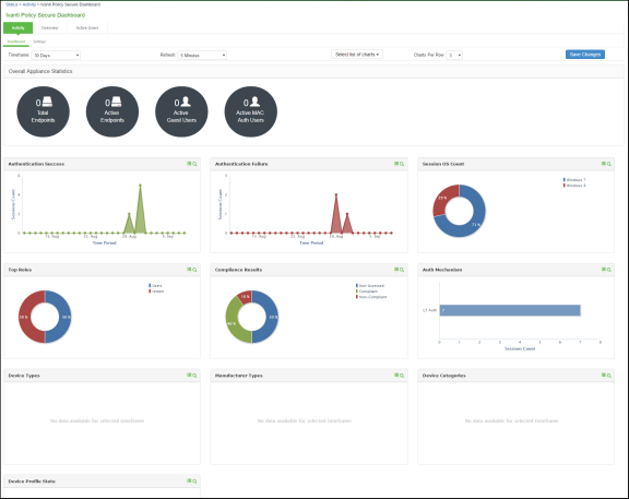 The dashboard database is created only after upgrading to Ivanti Policy Secure version 5.0 or later and enabling the dashboard option. Note that only new sessions are added to the database and changing the Time Frame filter or clicking refresh sends queries to the database. The data is collected only when the dashboard option is enabled.