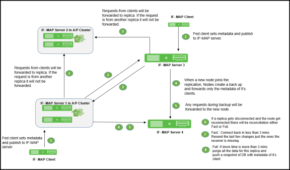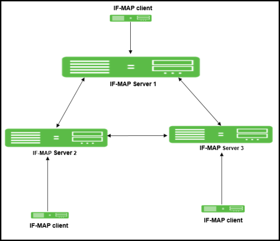 Each replica IF-MAP server communicates in a bidirectional way with all the connected IF-MAP server replicas. The data on each IF-MAP server is available on every server and enhances the system performance. A 3-way replica in mesh topology in which all the servers are connected to each other is supported.
