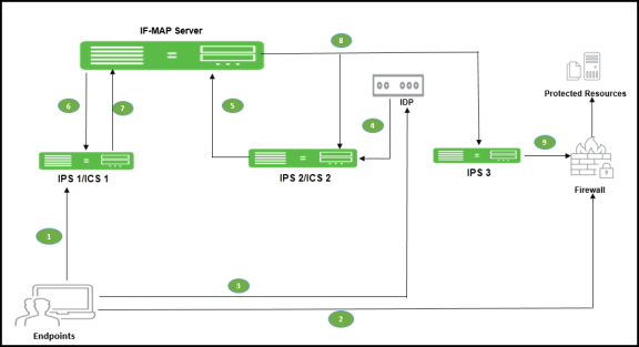 When any other Ivanti Policy Secure or Ivanti Connect Secure polls the IF-MAP server, the newly published session information for the user determines the protected resources that the user can access. The following figure shows a deployment with IDP.