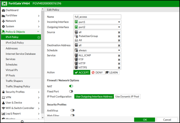 Create a firewall policy to use the Ivanti Policy Secure enforcement groups just created. Select Policy & Objects > IPv4 Policy. Click Create New and create the policy based on the resource access restrictions to be enforced.