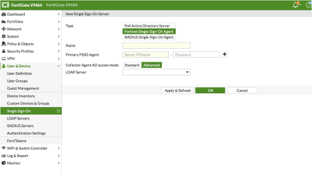 (Applies to Release 5.6.*) Create the FortiAuthenticator as an FSSO agent in the FortiGate Firewall. Select User & Device >Single Sign-On and click Create New and enter the following data.