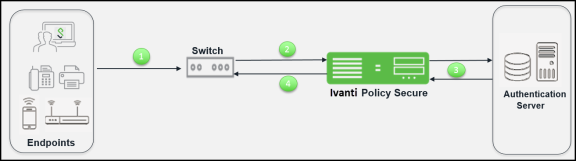 - The switch receives the request and starts the RADIUS authentication with Ivanti Policy Secure.