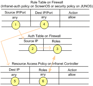 The Infranet Enforcer detects a flow to a specific resource and compares the source IP of the packet with IP addresses in the auth tables. The IP address is associated with a set of roles in the auth table. The destination IP of the packet is matched with the destination IP of a resource access policy to which a set of roles has been assigned. The Infranet Enforcer parses the roles in the resource access policy to determine whether or not the role can access the resource.