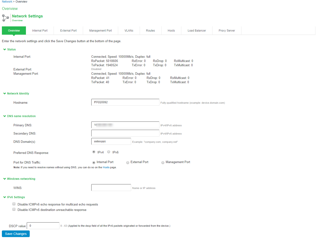 You configure DNS and WINS services when you initially configure the system with the serial console. If necessary, you can use the System > Network > Overview page to modify the configuration. You can also use this page to configure a hostname.