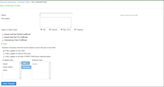 •Policy applies to SELECTED roles—To apply this profile only to users who are mapped to roles in the Selected roles list. Make sure to add roles to this list from the Available roles list.