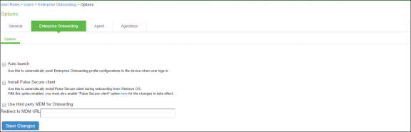 - Auto launch – Displays the onboarding page when the user logs in to Ivanti Policy Secure if enterprise onboarding is enabled for the user’s role (the default). If this option is disabled, an onboarding link is displayed on the home page.