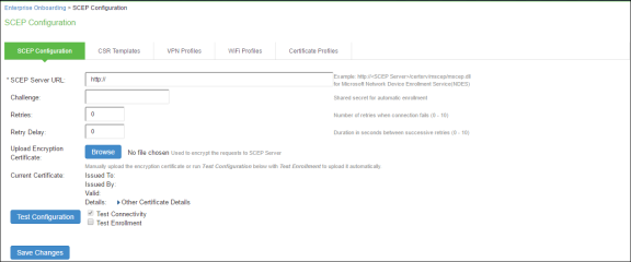 Click Browse to upload the certificate used to encrypt SCEP requests. To upload the certificate automatically, select the Test Enrollment check box, select a CSR template, and click Test Configuration.