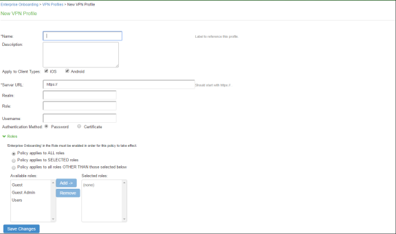 VPN profiles provide Android and iOS devices with secure access to enterprise networks. One or more VPN profiles can be assigned to specific user roles or to all roles. Up to 10 profiles can be defined.